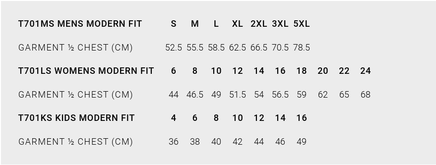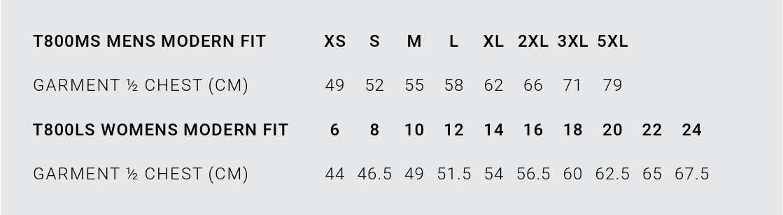 | Garment ½ Chest (cm) | 52 | 55 | 58 | 62 | 65 | 71 | 79 |